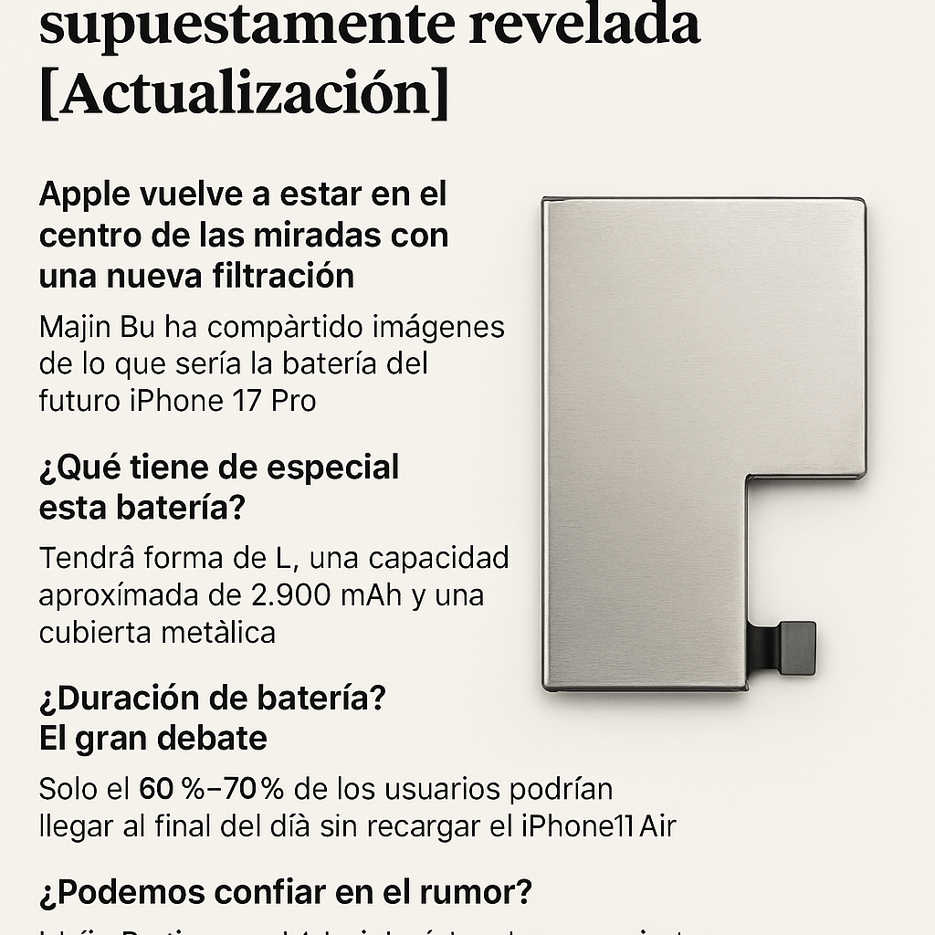 Parece que no hay semana sin rumores sobre la próxima generación de iPhone. Esta vez, el conocido filtrador Majin Bu ha dado de qué hablar al compartir imágenes de lo que sería la batería del futuro iPhone 17 Pro. Sí, has leído bien, no del modelo Air, como se creía inicialmente, sino del Pro.